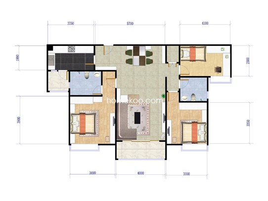 03单元户型图面积101.00㎡(3房)