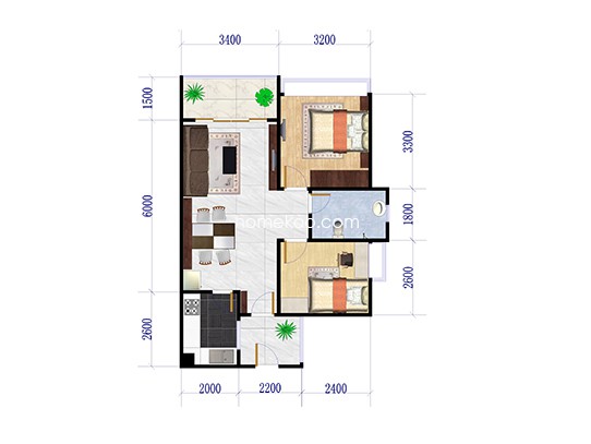 125平单位户型 2室2厅2卫1厨